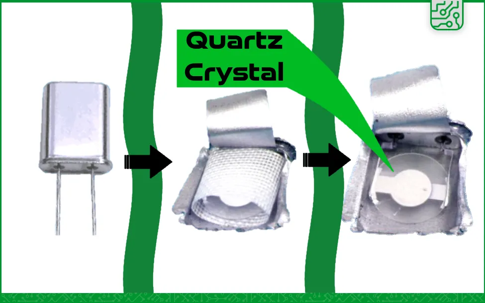 کریستال کوارتز (Quartz Crystal) یک قطعۀ پیزوالکتریک است. یعنی انرژی الکتریکی را به انرژی مکانیکی تبدیل می کند و بالعکس. از این قطعه برای ساخت یک قطعه الکترونیکی به نام کریستال استفاده می شود. پس از شکافتن یک کریستال الکترونیکی، در تصویر زیر نمای داخلی و خارجی یک کریستال الکترونیکی را مشاهده می کنید که در داخل آن یک لایۀ بسیار نازک از کریستال کوارتز قرار دارد.